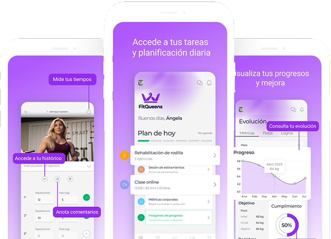 Mi programa de entrenamiento en GYM + plan de alimentación lo tendrás disponible en tu dispositivo móvil con mi app exclusiva “FitQueens”, compatible en Google Play y en iOS, ahí encontrarás tu rutina diaria, plan de alimentación, mi recetario con más de 300 recetas y opciones para sustituir, videos de los ejercicios explicados, acompañamiento semipersonalizado, área para registrar tu progreso, asesorías y acceso 24/7 desde cualquier parte del mundo.